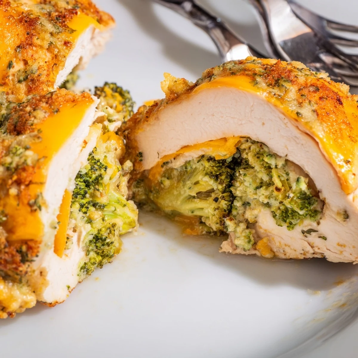 Stuffed chicken breasts are patted dry, seasoned with garlic powder, paprika and salt, then sliced to form pockets and filled with finely chopped broccoli, sharp cheddar, cream cheese, Parmesan and a touch of Dijon for tang. Secure with toothpicks, brush with olive oil and bake at 400°F (200°C) for 25–30 minutes until the center reaches 165°F (74°C). Let rest 5 minutes. Serves 4. Variations include adding cooked bacon or swapping cheddar for mozzarella or Swiss to change flavor and melt.
