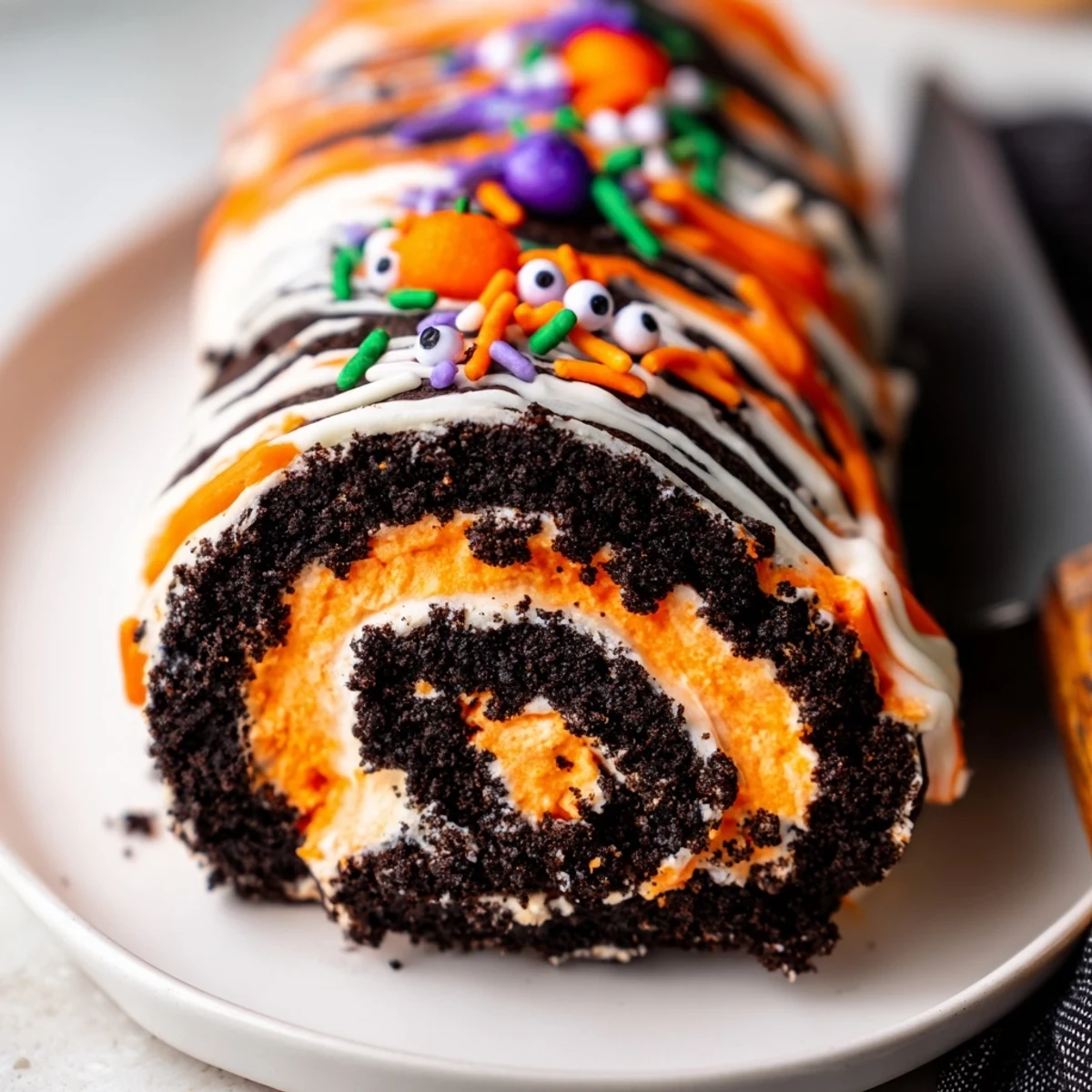 The base blends Halloween Oreos with cream cheese and butter for a rich, fudgy texture, while the whipped cream filling gets its festive orange or purple hue from food coloring. Roll it up, refrigerate until firm, then decorate with sprinkles, candy eyes, and chocolate drizzle for that totally epic presentation.