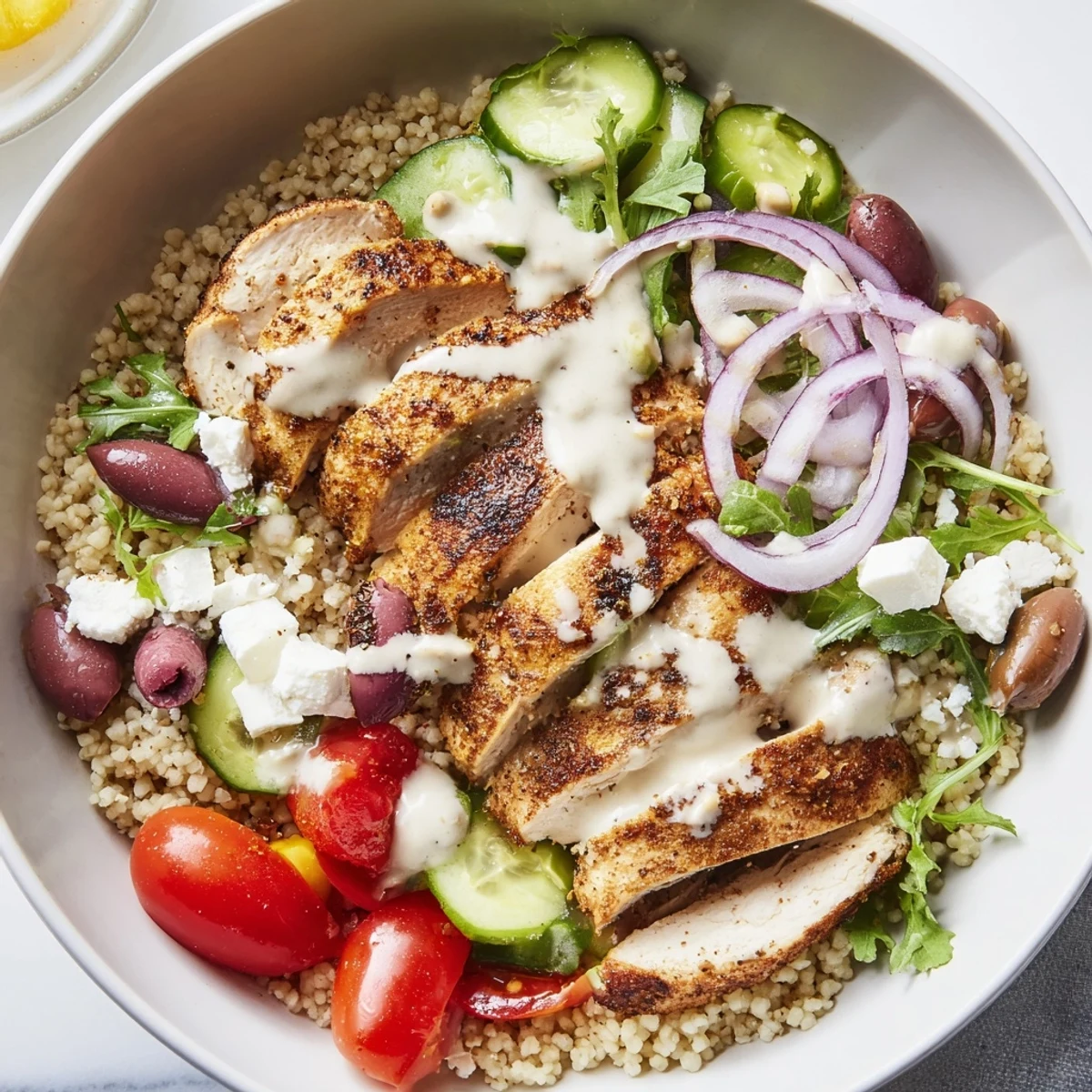 - Start with a base of fluffy couscous in each bowl, then arrange the spinach or arugula, sliced chicken, tomatoes, cucumber, red onion, olives, and feta on top in sections. Drizzle generously with the lemon-tahini sauce and finish with a sprinkle of fresh parsley.