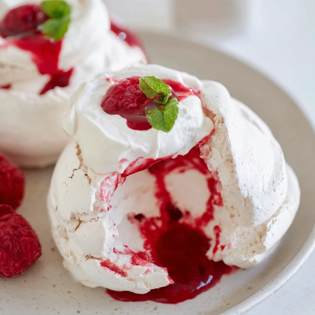 These delicate Pavlova bombs feature crisp meringue shells with soft, marshmallow-like centers. Each shell is hand-filled with lightly sweetened whipped cream, then generously topped with vibrant raspberry coulis. The contrast of textures—crunchy exterior yielding to pillowy meringue and silky cream—creates an irresistible dessert experience. The tart, bright raspberry sauce perfectly balances the sweet meringue, while fresh mint and berries add visual appeal and extra flavor dimension.