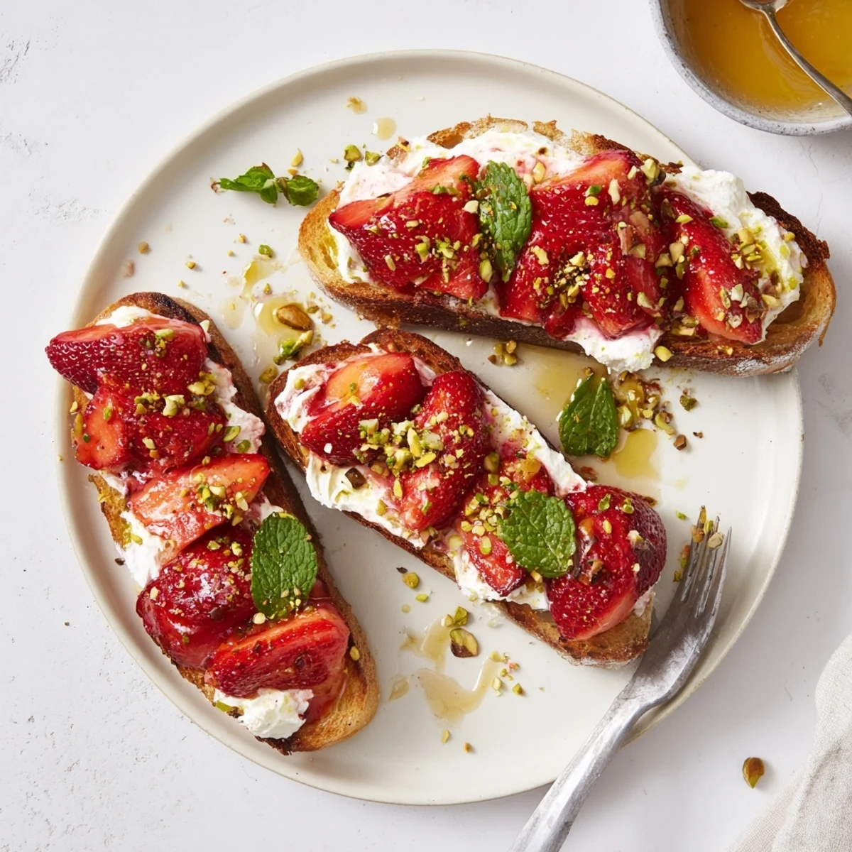 This elegant toast brings together the velvety richness of whipped ricotta with the concentrated sweetness of oven-roasted strawberries. The preparation is straightforward: roast fresh strawberries with honey and vanilla until they soften into a syrupy compote, then whip ricotta with cream and lemon zest until aerated and smooth. Layer the whipped cheese onto golden-brown sourdough or country bread, crown with the ruby-red berries, and finish with fresh mint, flaky sea salt, and a drizzle of honey. Each bite balances creamy, sweet, and salty notes while crisp toast provides satisfying crunch. The dish comes together in just 30 minutes and serves four generously.
